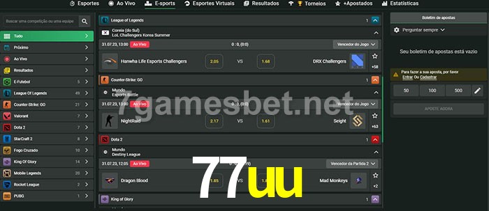 O 77uu oferece uma grande seleção de opções de apostas em e-sports com probabilidades competitivas